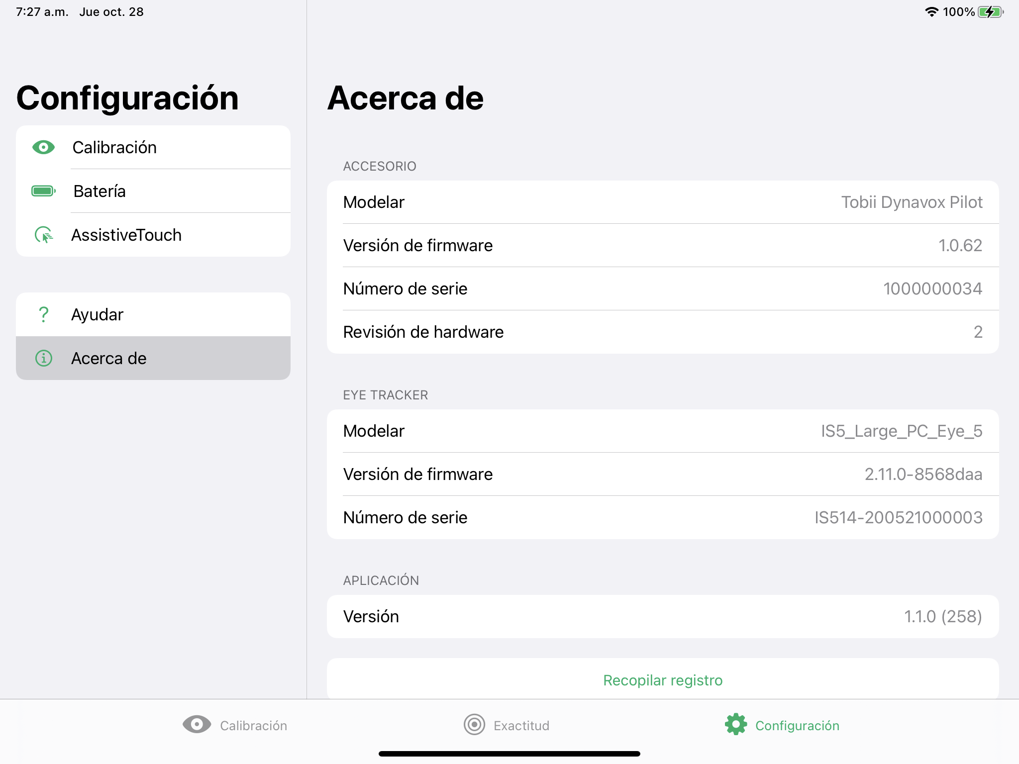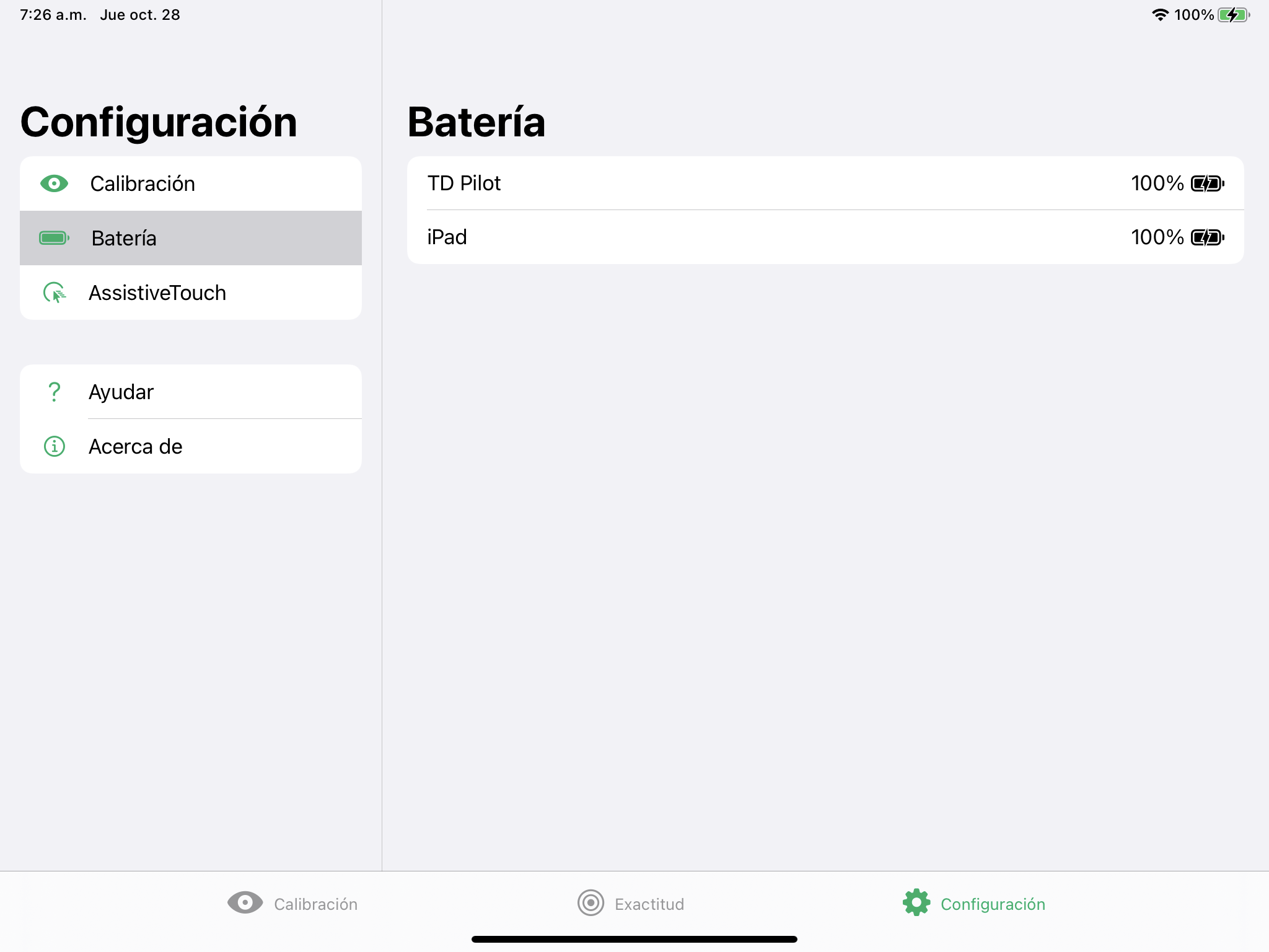 El software del TD CoPilot puede utilizarse para calibrar el seguidor ocular, definir los ajustes de calibración, comprobar la duración de la batería del TD Pilot Base, etc.