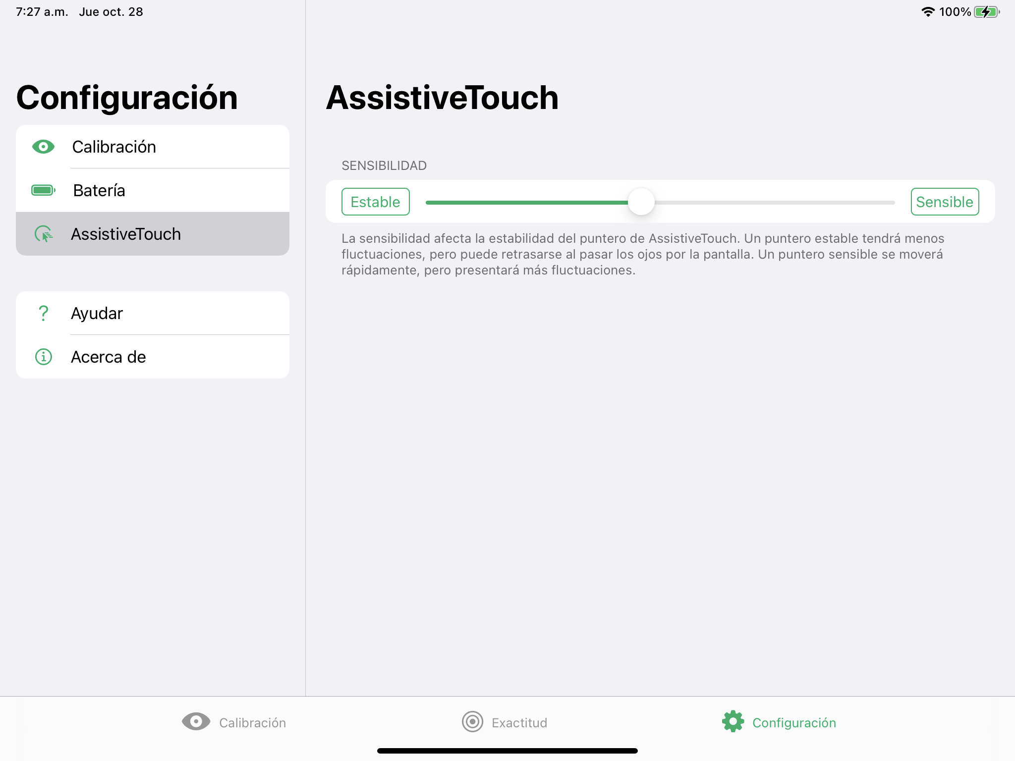 La sensibilidad afecta la estabilidad del puntero de AssistiveTouch. Un puntero estable tendrá menos fluctuaciones, pero puede retrasarse al pasar los ojos por la pantalla. Un puntero sensible se moverá rápidamente, pero presentará más fluctuaciones.