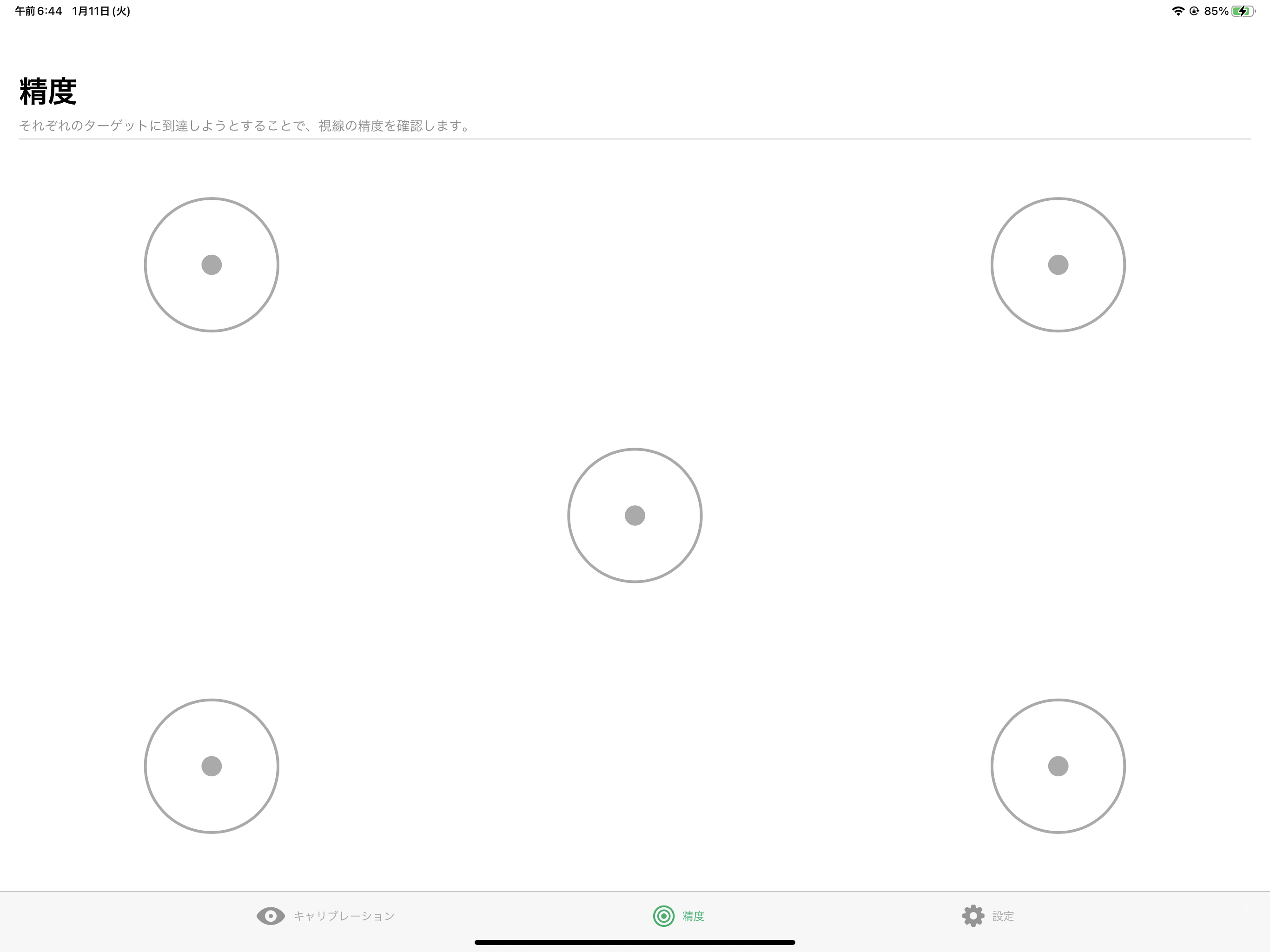 画面上の各円内の各点を見て、その領域内のアイトラッキングの正確さを確認します。
