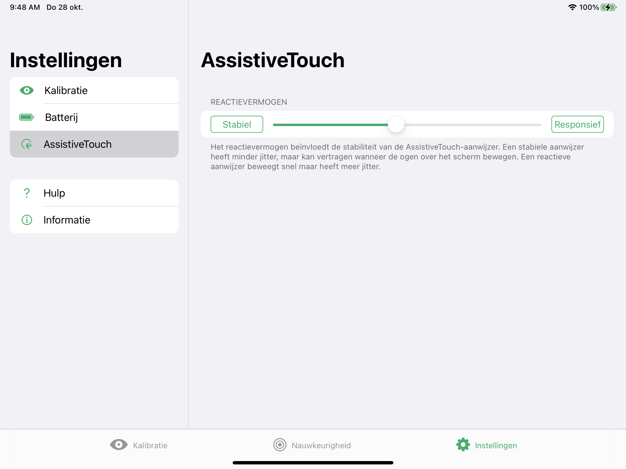 Het reactievermogen beïnvloedt de stabiliteit van de AssistiveTouch-aanwijzer. Een stabiele aanwijzer heeft minder jitter, maar kan vertragen wanneer de ogen over het scherm worden bewogen. Een responsieve aanwijzer beweegt snel, maar heeft meer jitter.
