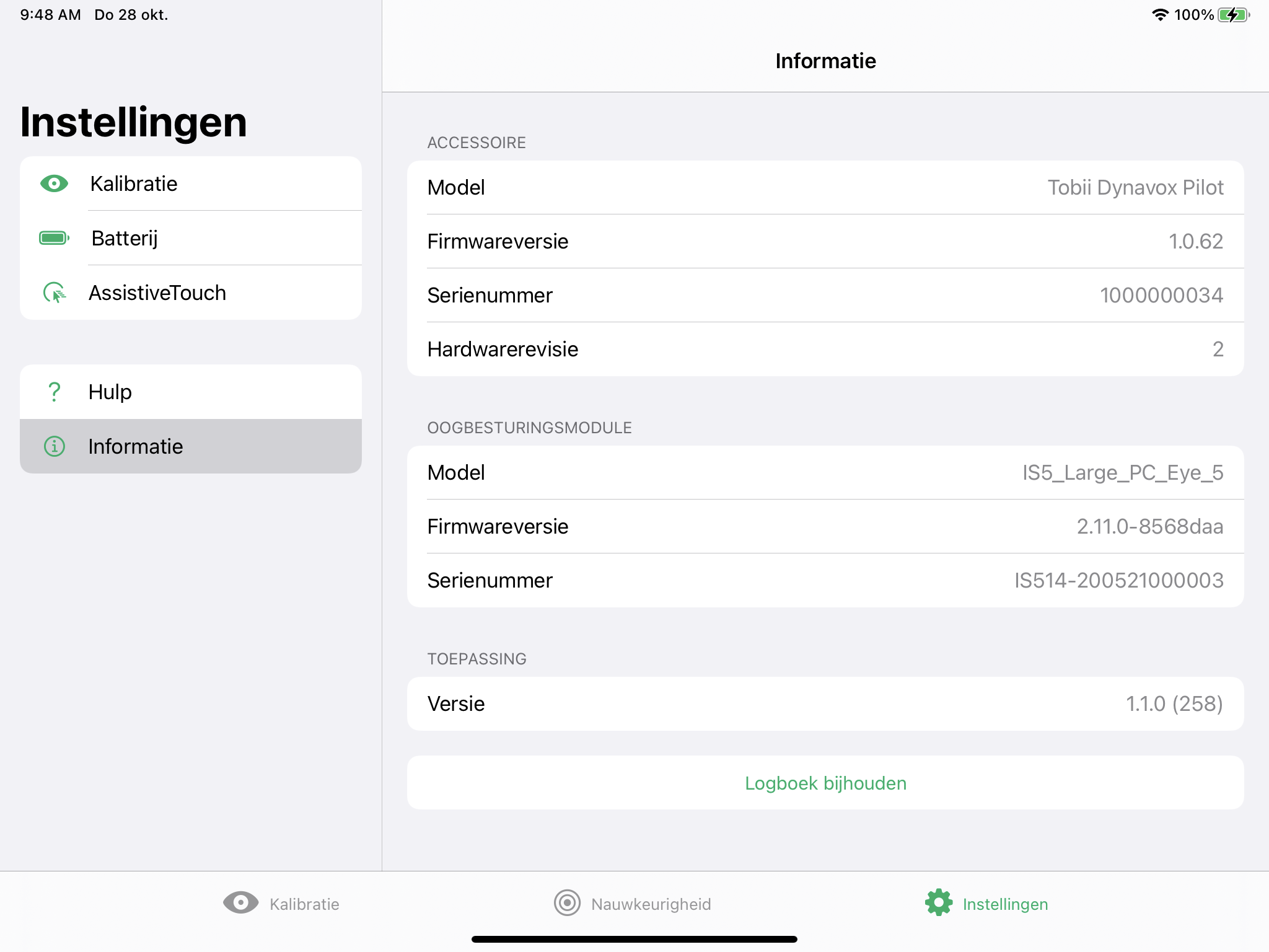 Om de logboeken voor de TD Pilot en oogbesturingsmodule bij te houden: