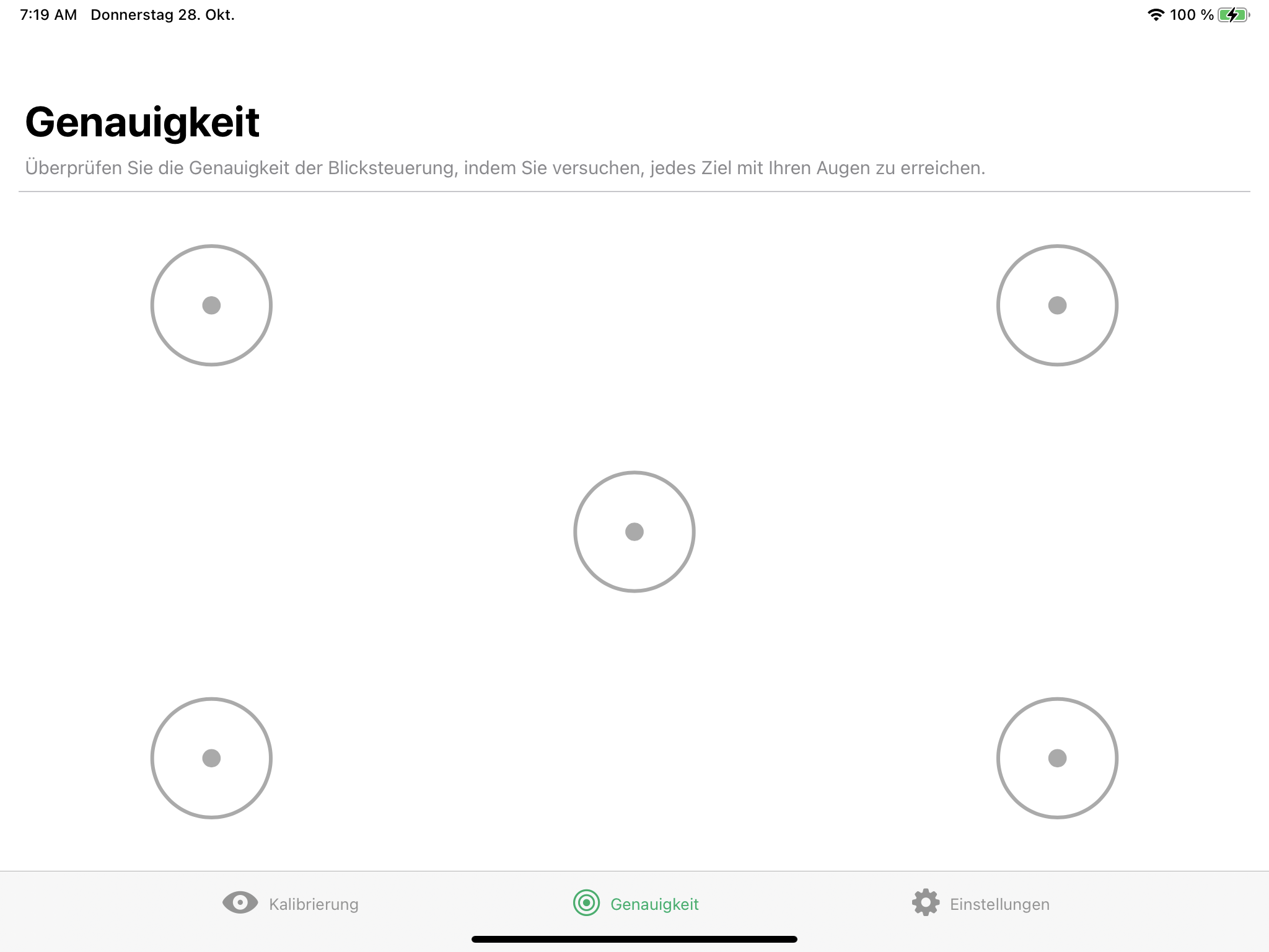 Richten Sie Ihren Blick auf jeden der eingekreisten Punkte auf dem Bildschirm um festzustellen, wie präzise die Augensteuerung in diesem Bereich ist.