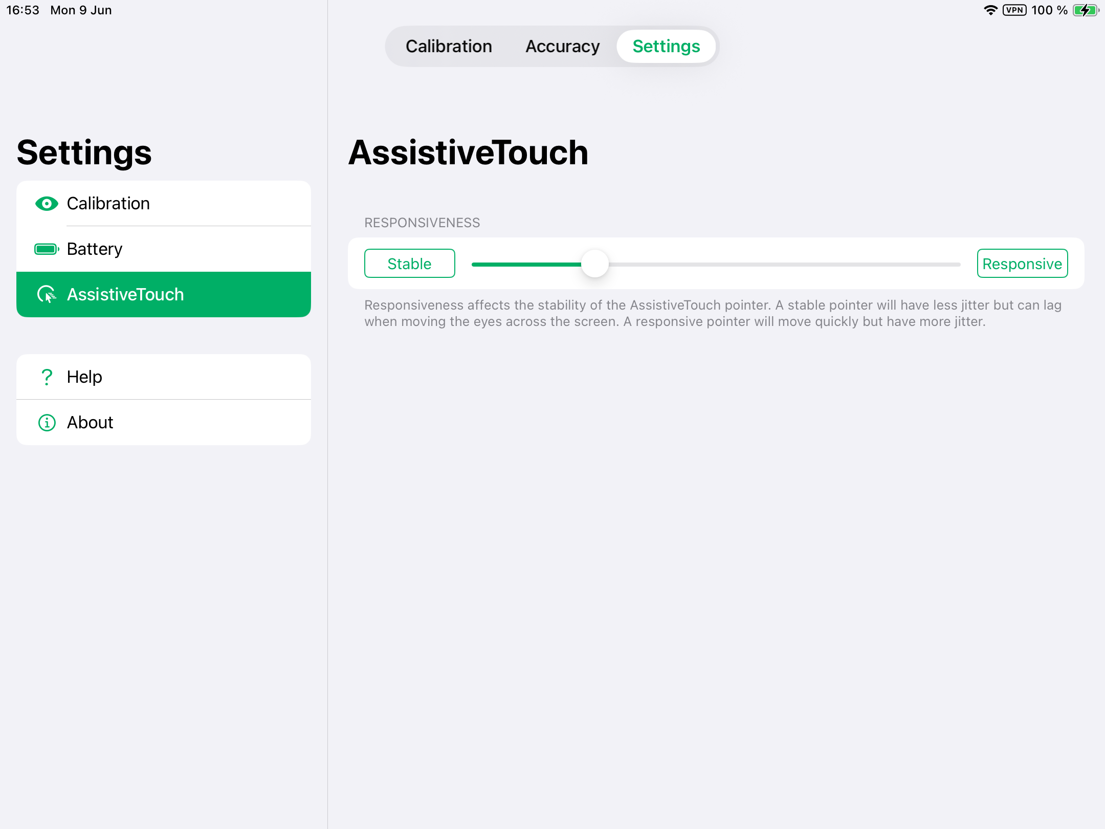 Responsiveness affects the stability of the AssistiveTouch pointer.. A stable pointer will have less jitter but can lag when moving the eyes across the screen. A responsive pointer will move quickly but have more jitter.