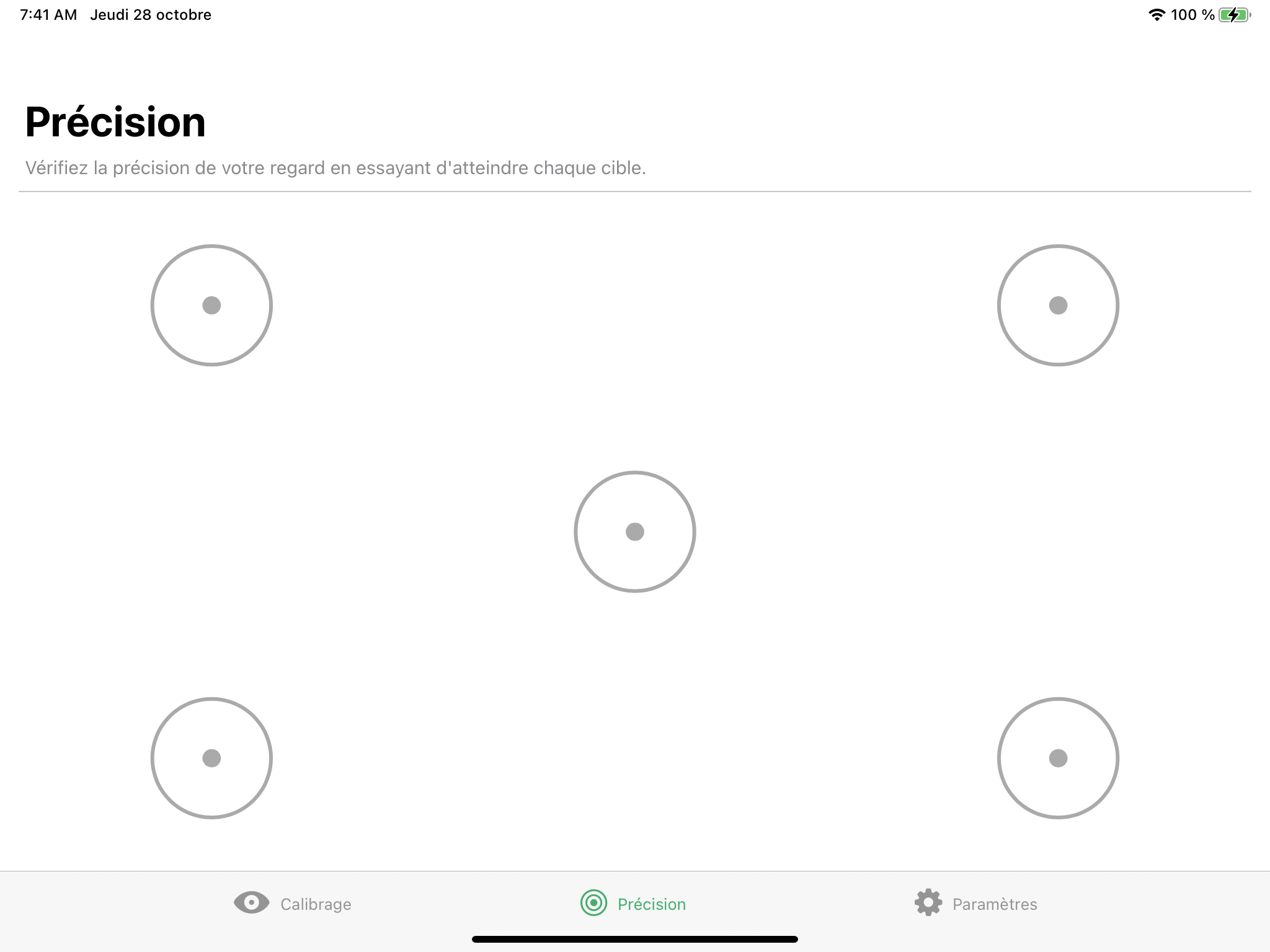 Il est possible de tester le calibrage sur la page Précision. Le calibrage peut être testé à l’aide de cibles prédéfinies sur l’écran afin de voir si un recalibrage de la commande oculaire est nécessaire pour l’utilisateur.