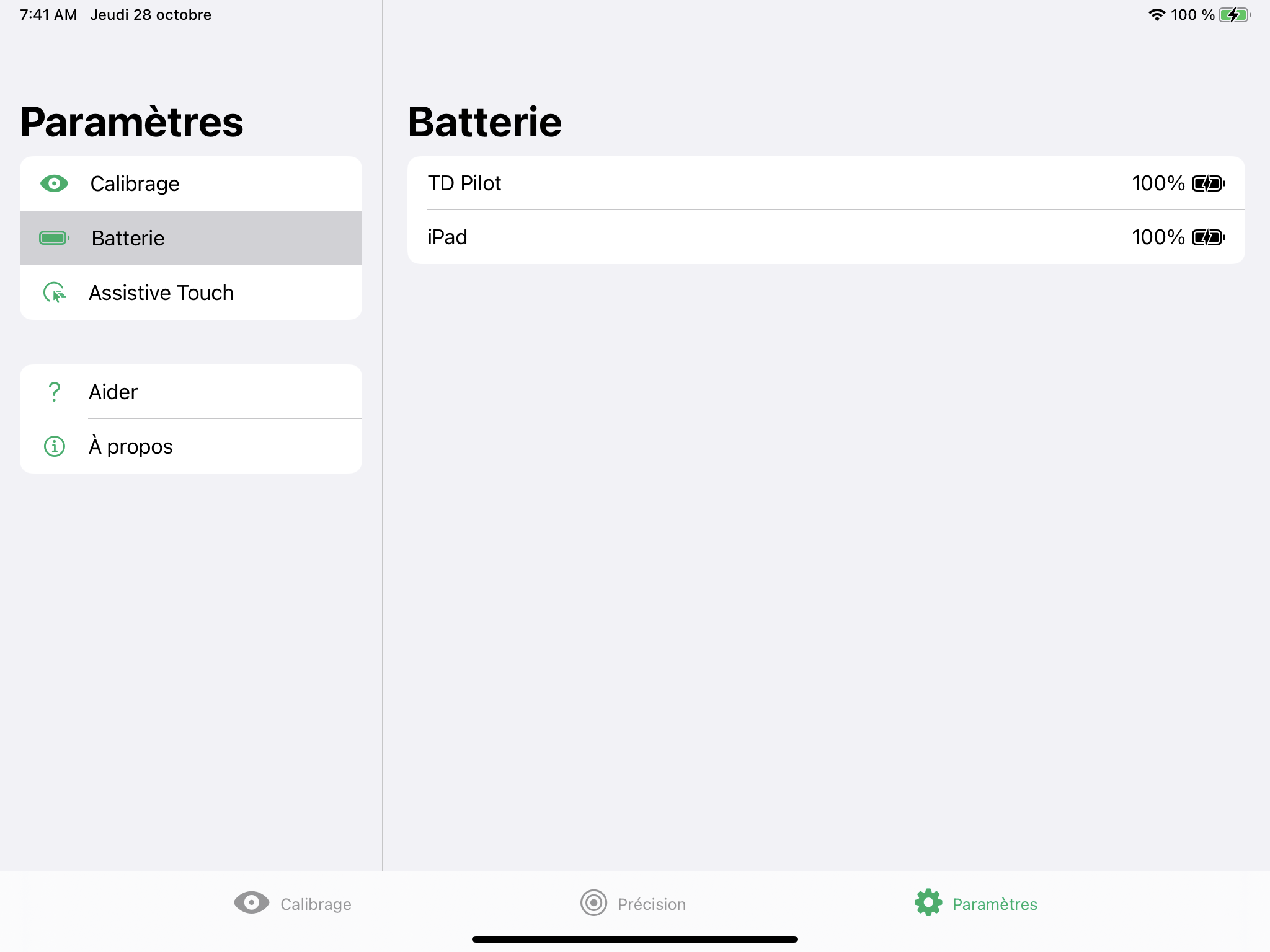 Le logiciel TD CoPilot peut être utilisé pour calibrer la commande oculaire, définir les paramètres de calibrage, vérifier la durée de vie de la batterie du TD Pilot Base etc.