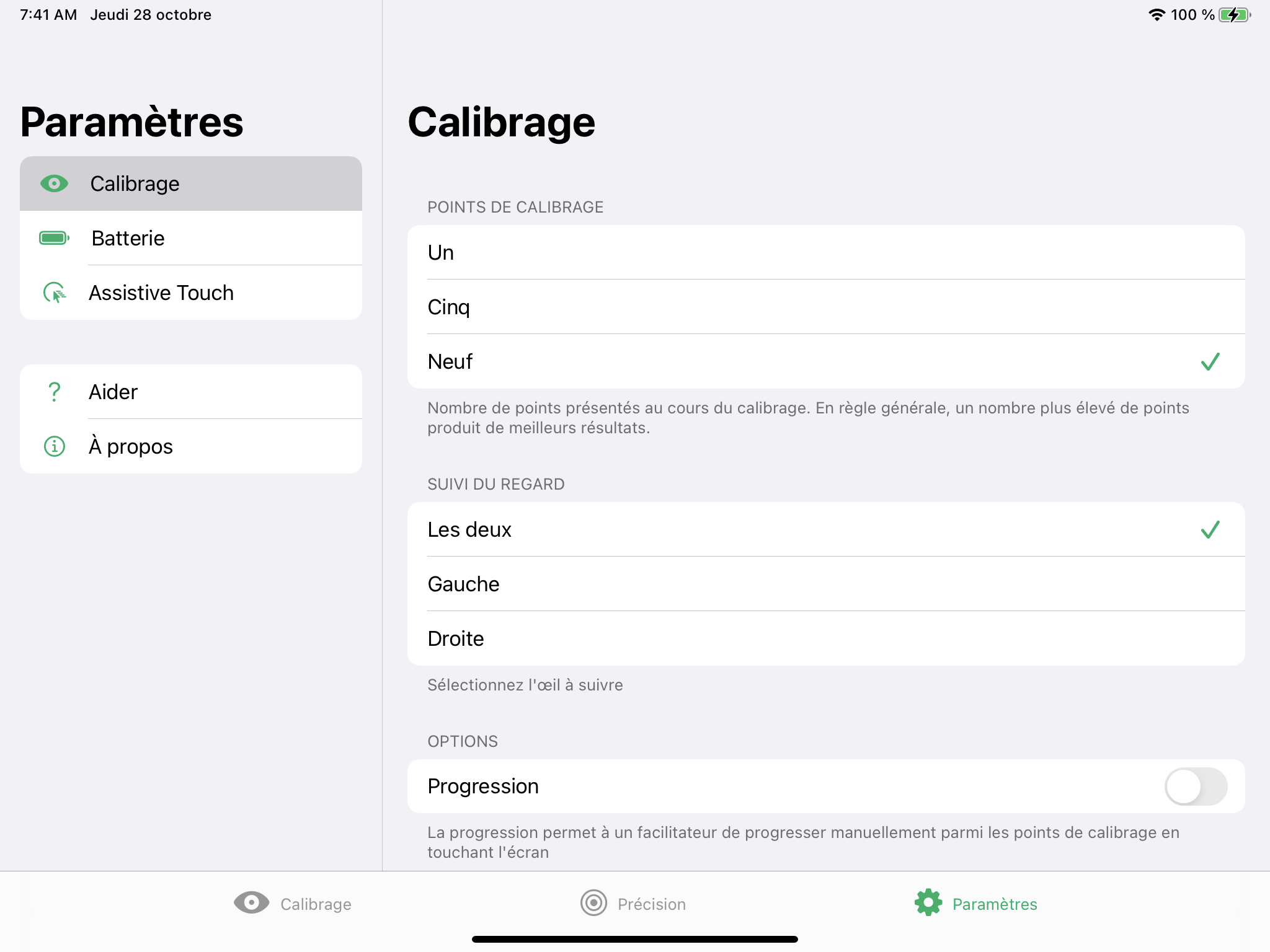 - La progression permet à un facilitateur de progresser manuellement parmi les points de calibrage en touchant l'écran (Option désactivée par défaut)