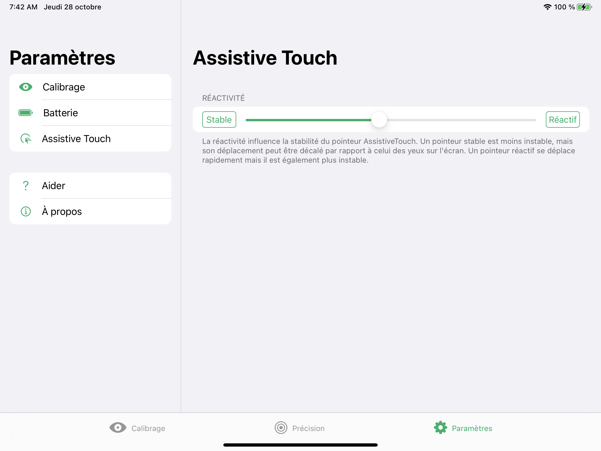 La réactivité influence la stabilité du pointeur d’AssistiveTouch. Un pointeur stable est moins instable, mais son déplacement peut être décalé par rapport à celui des yeux sur l’écran. Un pointeur réactif se déplace rapidement, mais il est également plus instable.