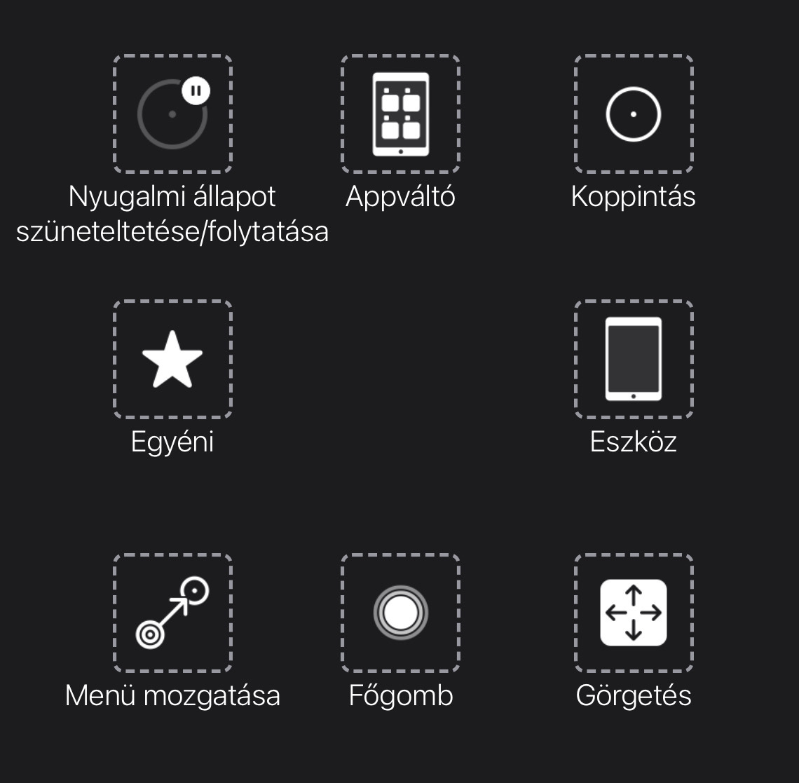 Az „Érintés” és a „Görgetés” funkciók az AssistiveTouch menü legfelső szintjén érhetők el. Az egyéb érintéses gesztusok, mint például a „Tartás és húzás”, a „Hosszú nyomás” és a „Kétszeri koppintás”, az AssistiveTouch menü „Egyéni” menüpontja alatt találhatók.