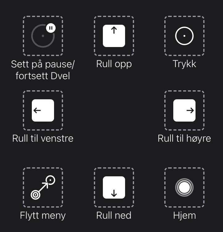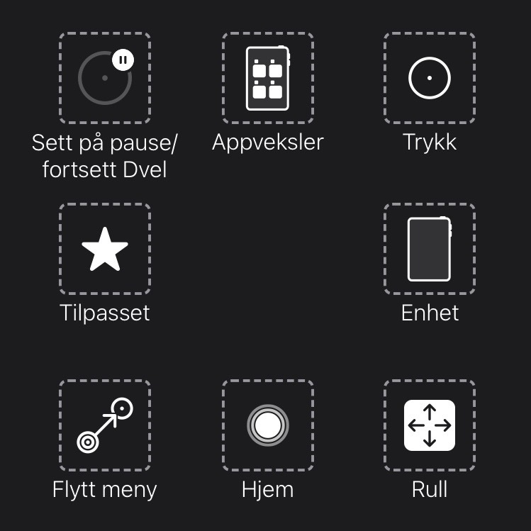 Trykk og skroll er tilgjengelig i AssistiveTouch-menyen på øverste nivå. Andre berøringsbevegelser, slik som hold og dra, langt trykk og dobbelttrykk finner du under Tilpasset i AssistiveTouch-menyen.