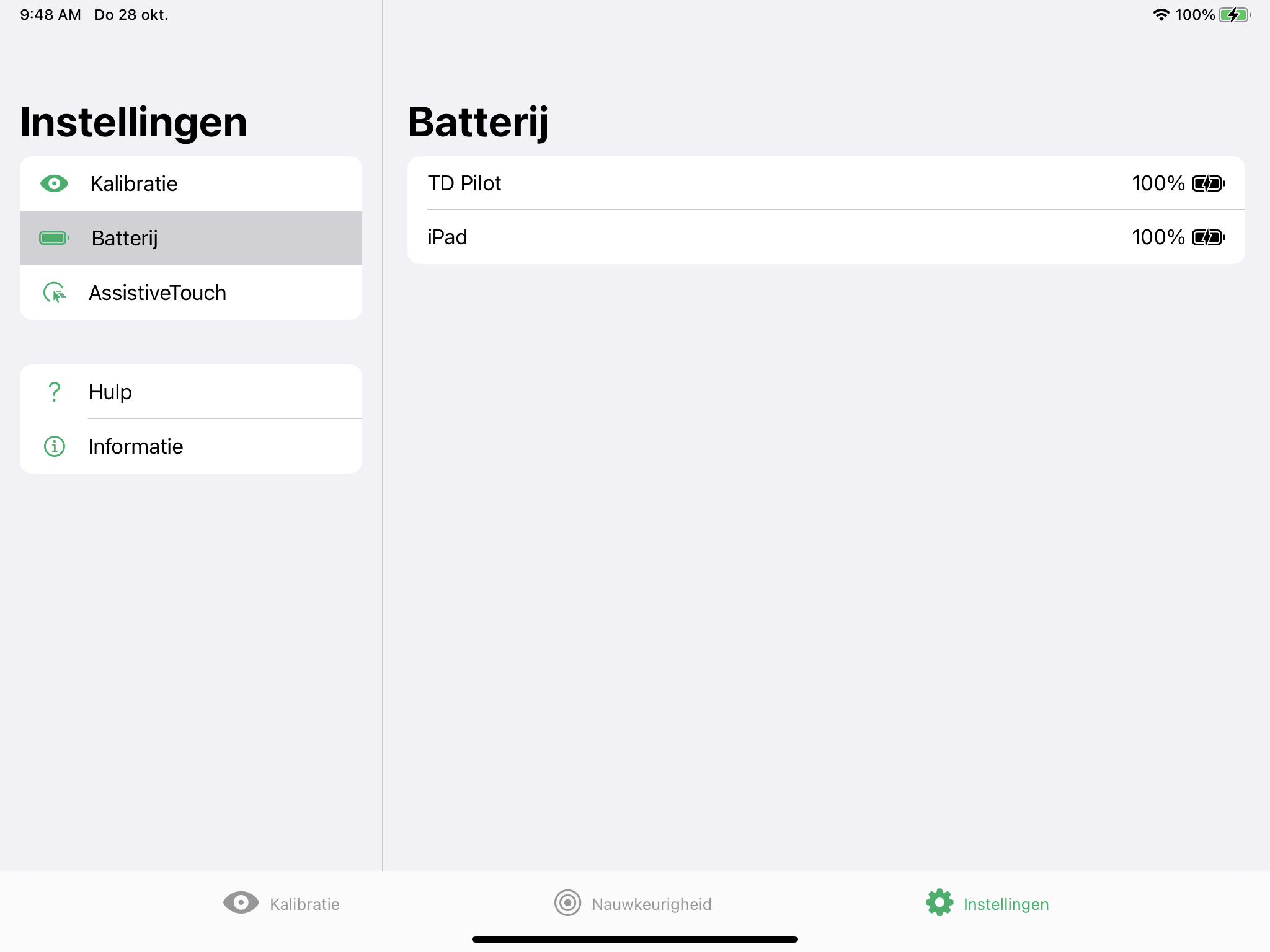 De TD CoPilot-software kan worden gebruikt om de oogbesturingsmodule te kalibreren, de instellingen voor de kalibratie te bepalen, de accucapaciteit van de TD Pilot Base te controleren, enz.