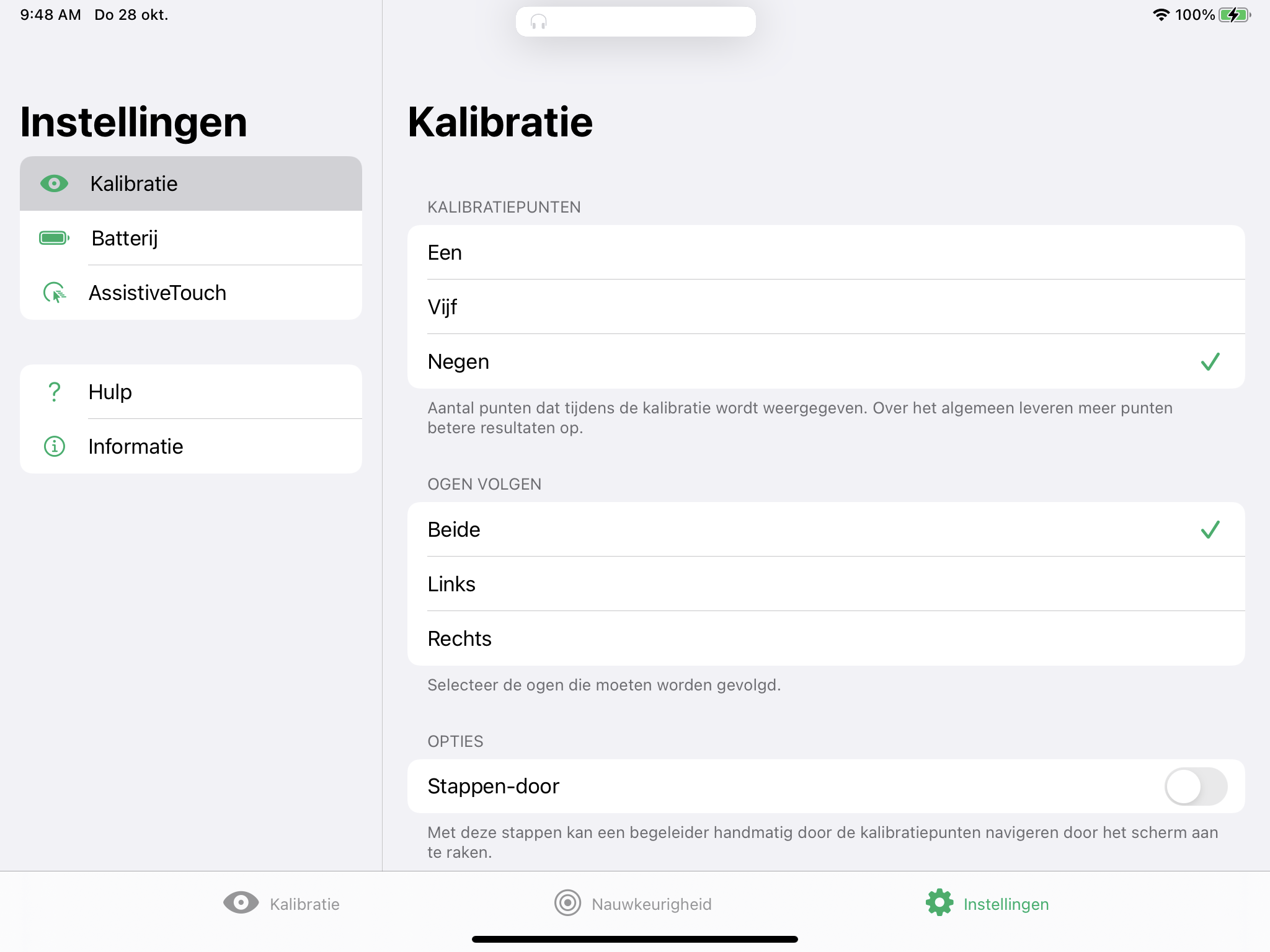 Selecteer hoeveel richtpunten worden gebruikt om de oogbesturingsmodule te kalibreren. Hoe meer kalibratiepunten worden gebruikt, hoe beter het kalibratieresultaat zal zijn: