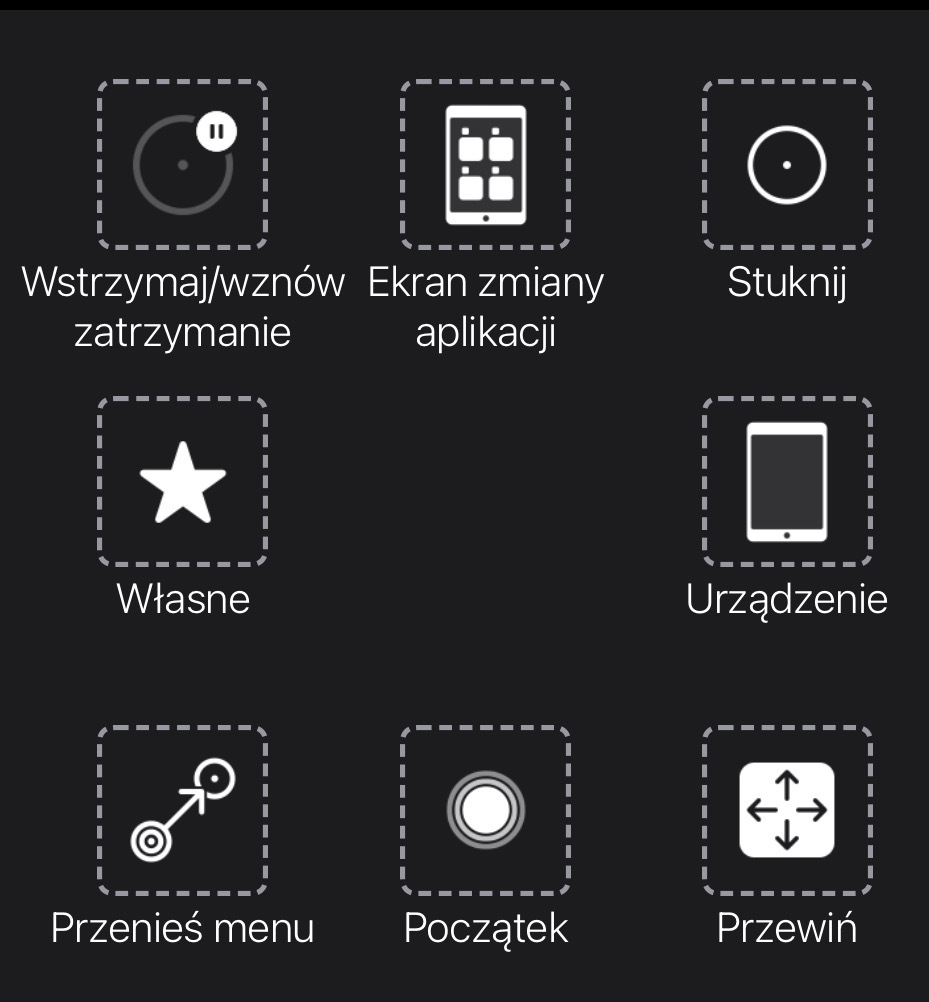 Funkcje dotykania i przewijania są dostępne w menu AssistiveTouch na najwyższym poziomie. Inne gesty dotykowe, takie jak przytrzymanie i przeciągnięcie, długie naciśnięcie oraz podwójne dotknięcie, znajdują się w sekcji Niestandardowe w menu AssistiveTouch.