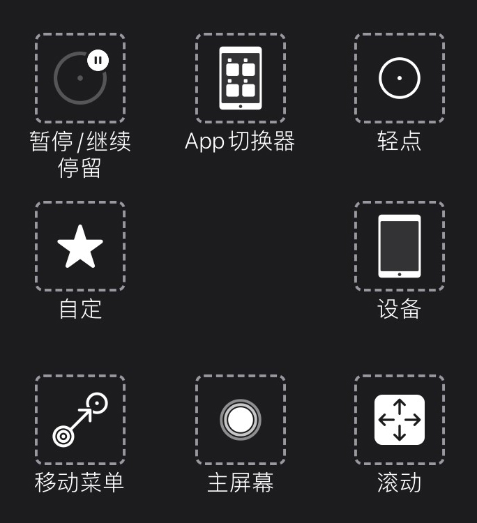 位于顶层的辅助触控菜单提供轻点与滚动功能。其他触控手势(例如按住并拖动、长时间按住以及双击)位于辅助触控菜单中的“自定义”下方。