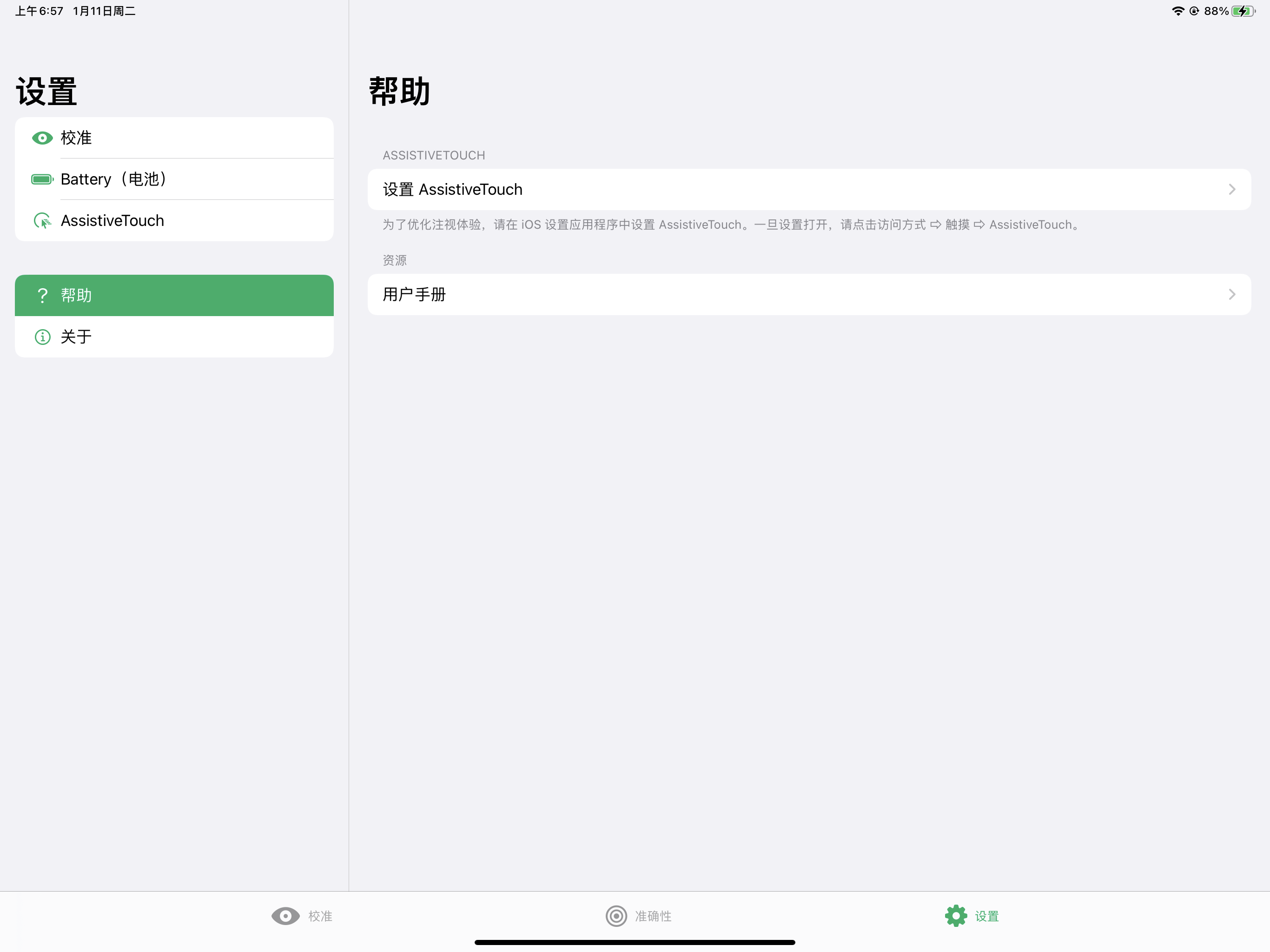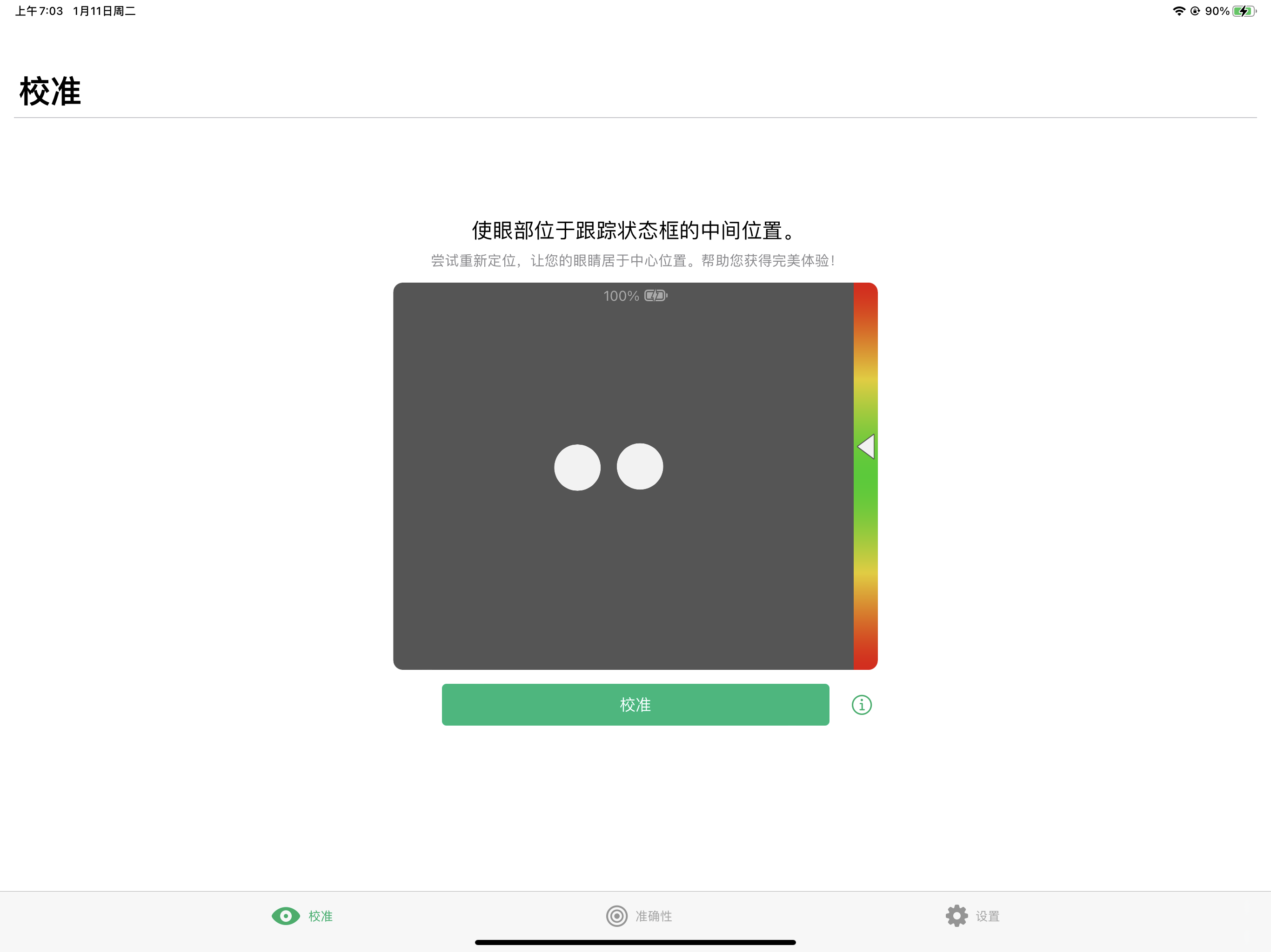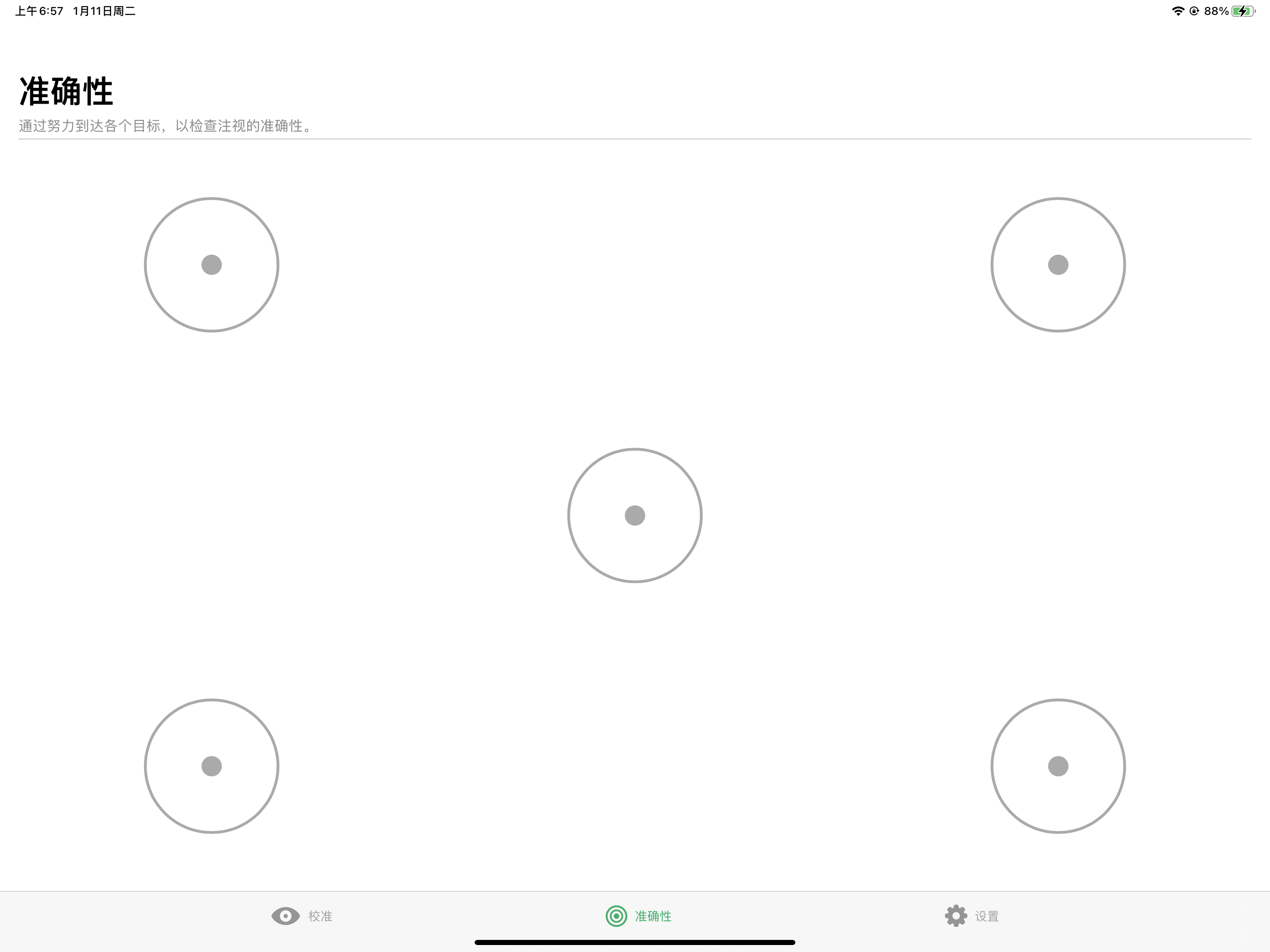 在“准确性”页面上,可以利用屏幕上目标点来测试校准的准确度,再决定是否需要重新校准。