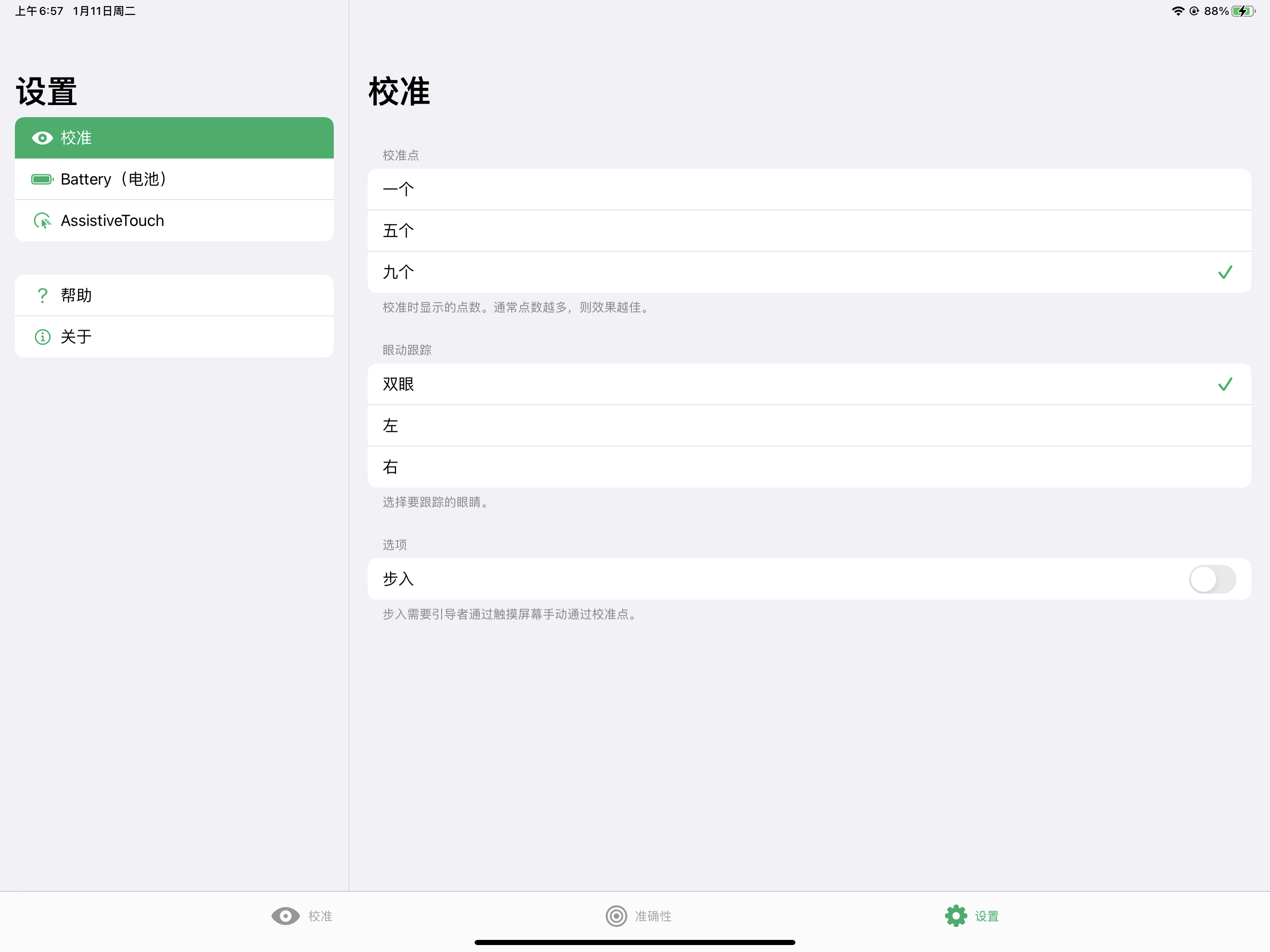- “步入”开启后,陪护助手将通过点按屏幕来进入下一个校准点的校准。(默认状态为关闭)