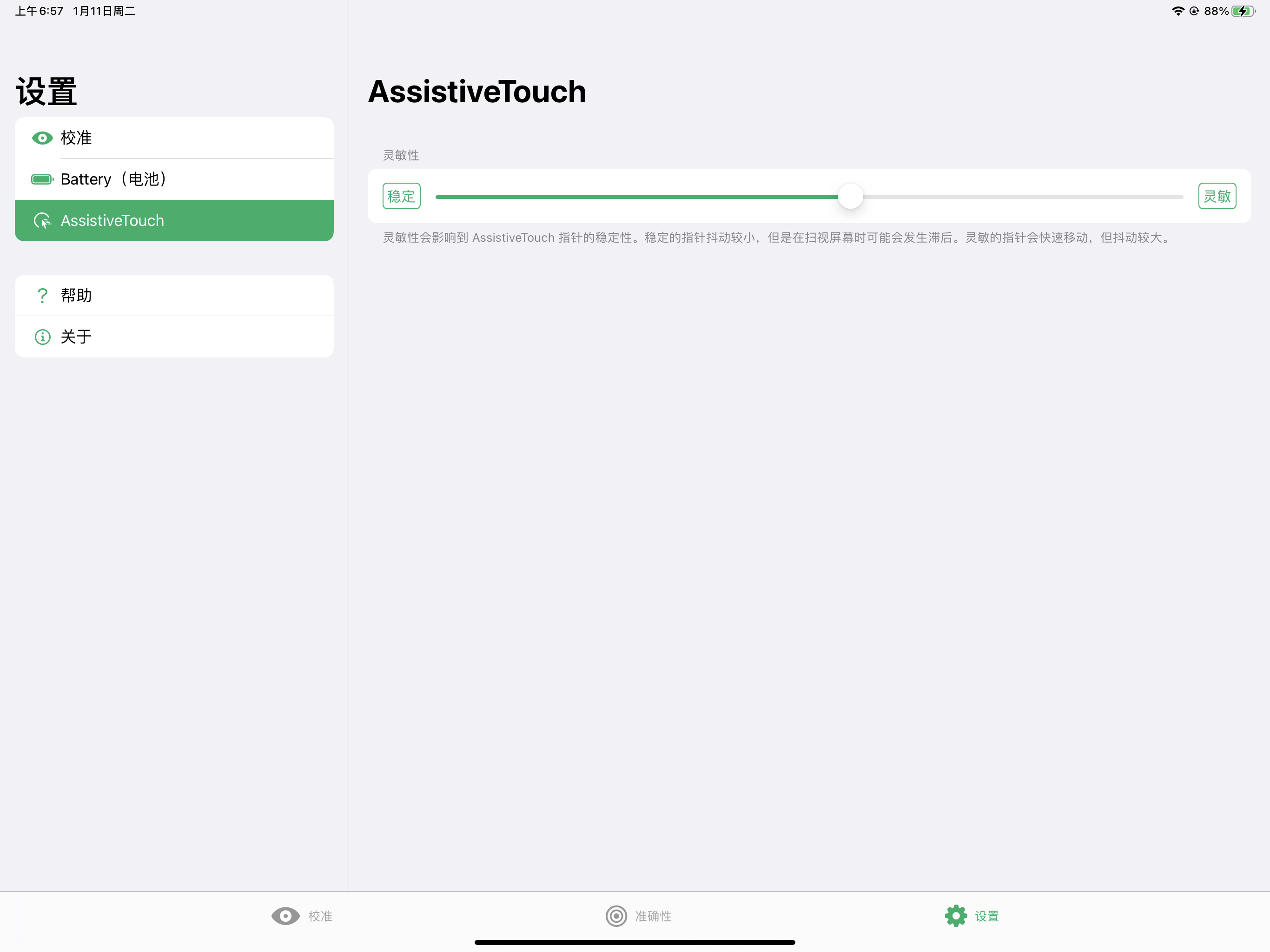 灵敏性会影响到辅助触控指针的稳定性。稳定是指针抖动较小,但是当在屏幕上移动眼睛时指针移动会发生滞后。灵敏是指针可快速移动,但是抖动较大。